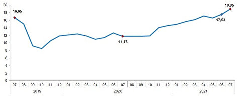 TÜFE'de 2021 yılı Temmuz ayında bir önceki aya göre %1,80, bir önceki yılın Aralık ayına göre %10,41, bir önceki yılın aynı ayına göre %18,95 ve on iki aylık ortalamalara göre %15,15 artış gerçekleşti.