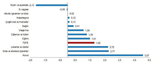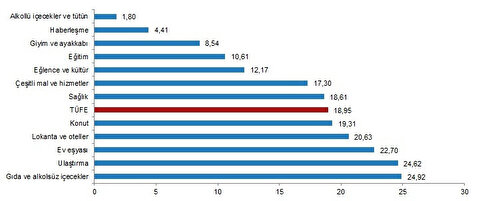 Yıllık en düşük artış %1,80 ile alkollü içecekler ve tütün grubunda gerçekleşti. Bir önceki yılın aynı ayına göre artışın düşük olduğu diğer ana gruplar sırasıyla, %4,41 ile haberleşme, %8,54 ile giyim ve ayakkabı ve %10,61 ile eğitim oldu. Buna karşılık, bir önceki yılın aynı ayına göre artışın yüksek olduğu ana gruplar ise sırasıyla, %24,92 ile gıda ve alkolsüz içecekler, %24,62 ile ulaştırma ve %22,70 ile ev eşyası oldu.
