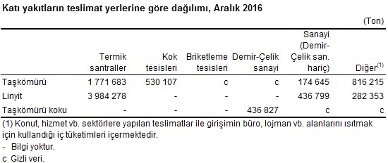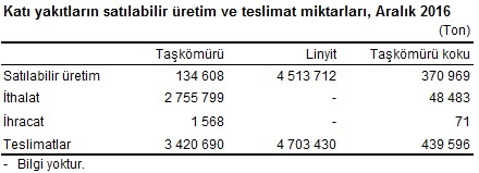 katı yakıtların 2016 yılı Aralık ayı toplam satılabilir üretim miktarlarına bakıldığında; taşkömürünün 134 bin 608 ton, linyitin 4 milyon 513 bin 712 ton ve taşkömürü kokunun 370 bin 969 ton, teslimat miktarlarına bakıldığında ise; taşkömürünün 3 milyon 420 bin 690 ton, linyitin 4 milyon 703 bin 430 ton ve taşkömürü kokunun 439 bin 596 ton olarak gerçekleştiği görüldü.