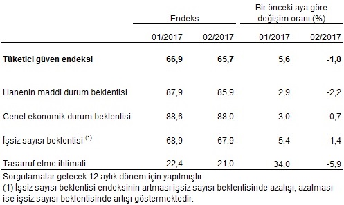 Türkiye İstatistik Kurumu ve Türkiye Cumhuriyet Merkez Bankası işbirliği ile yürütülen tüketici eğilim anketi sonuçlarından hesaplanan tüketici güven endeksi, Şubat ayında bir önceki aya göre yüzde 1,8 oranında azaldı; Ocak ayında 66,9 olan endeks değeri Şubat ayında 65,7 oldu.
