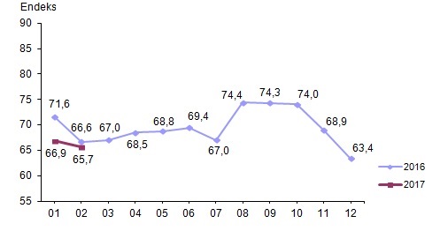 Tüketici güven endeksi Şubat ayında bir önceki aya göre yüzde 1,8 oranında azaldı; Ocak ayında 66,9 olan endeks değeri Şubat ayında 65,7 oldu.