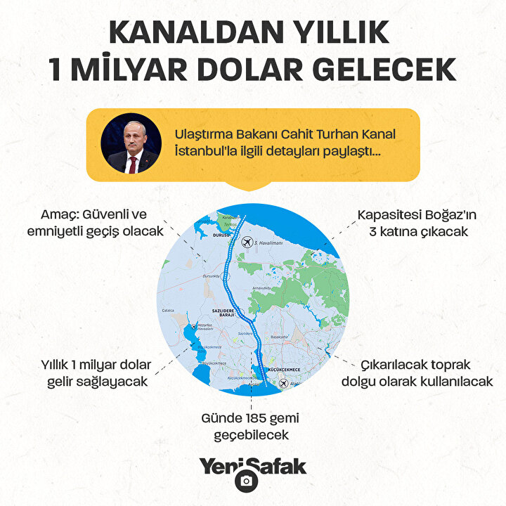 - "Otoyol standardındaki Kanal İstanbul'dan güvenli şekilde günde 185 gemi geçirebileceğiz. Şu anda Boğaz'dan 118-125 gemi geçirebiliyoruz."