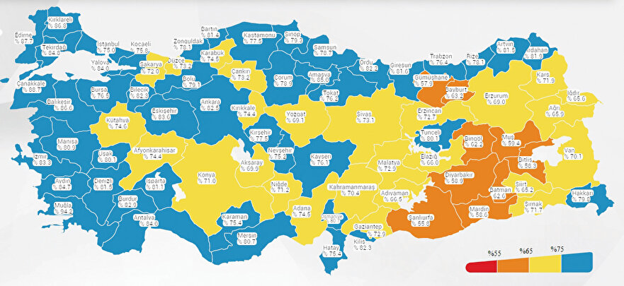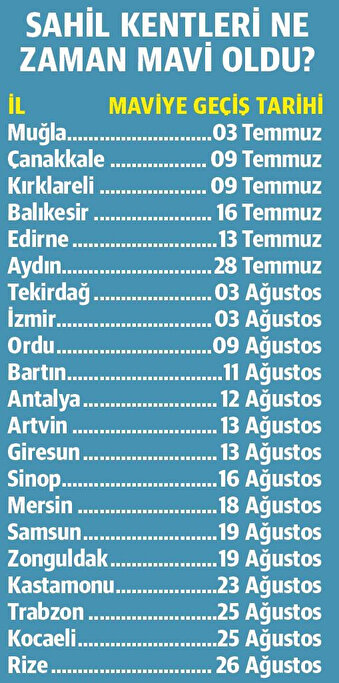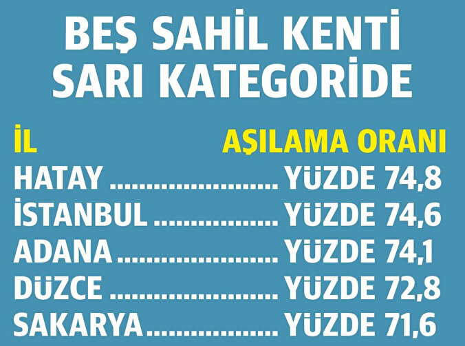 Artvin, Rize, Trabzon, Giresun, Ordu, Samsun, Sinop, Kastamonu, Bartın, Zonguldak, Düzce, Sakarya Kocaeli, İstanbul, Kırklareli, Tekirdağ, Edirne, Çanakkale, Balıkesir, İzmir, Aydın, Muğla, Antalya, Mersin, Adana ve Hatay illerinin denizlere kıyısı var. Bu 26 ilden 21’i aşılanabilir nüfusun yüzde 75’inden fazlasını aşıladı. Geriye kalan Düzce, Sakarya, İstanbul Adana ve Hatay’ın aşı haritasındaki rengi ise sarı. Muğla’nın 3 Temmuz’da maviye dönmesinin ardından, İzmir 3 Ağustos’ta, Antalya ise 12 Ağustos’ta haritada maviye boyandı.