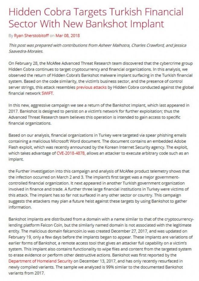 Dünya güvenlik devi McAfee'nin yayınladığı rapora göre Kuzey Koreli hacker grubu Hidden Cobra'nın Türkiye'deki finansal kurumlara saldırı gerçekleştirdiği öğrenildi. Hackerların saldırıları merak uyandıran bilgilerin yer aldığı word dosyaları ile gerçekleştirdiği belirtilirken, saldırılarda herhangi bir para veya dosyanın ise çalınmadığı kaydedildi.