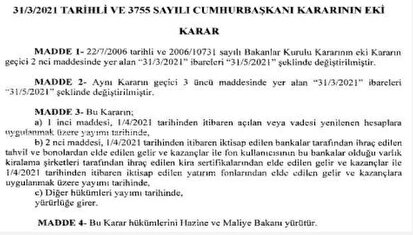 Cumhurbaşkanı Recep Tayyip Erdoğan'ın imzasıyla Resmi Gazete'de yayımlanan karara göre stopaj vergisi avantajı 2 ay daha sürecek.
