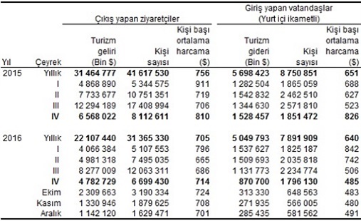 Ekim, Kasım ve Aralık aylarından oluşan 4. çeyrekte yurt dışını ziyaret eden vatandaş sayısı bir önceki yılın aynı çeyreğine göre yüzde 3 azalarak 1 milyon 796 bin 130 kişi oldu. Bunların kişi başı ortalama harcaması 485 dolar olarak gerçekleşti.