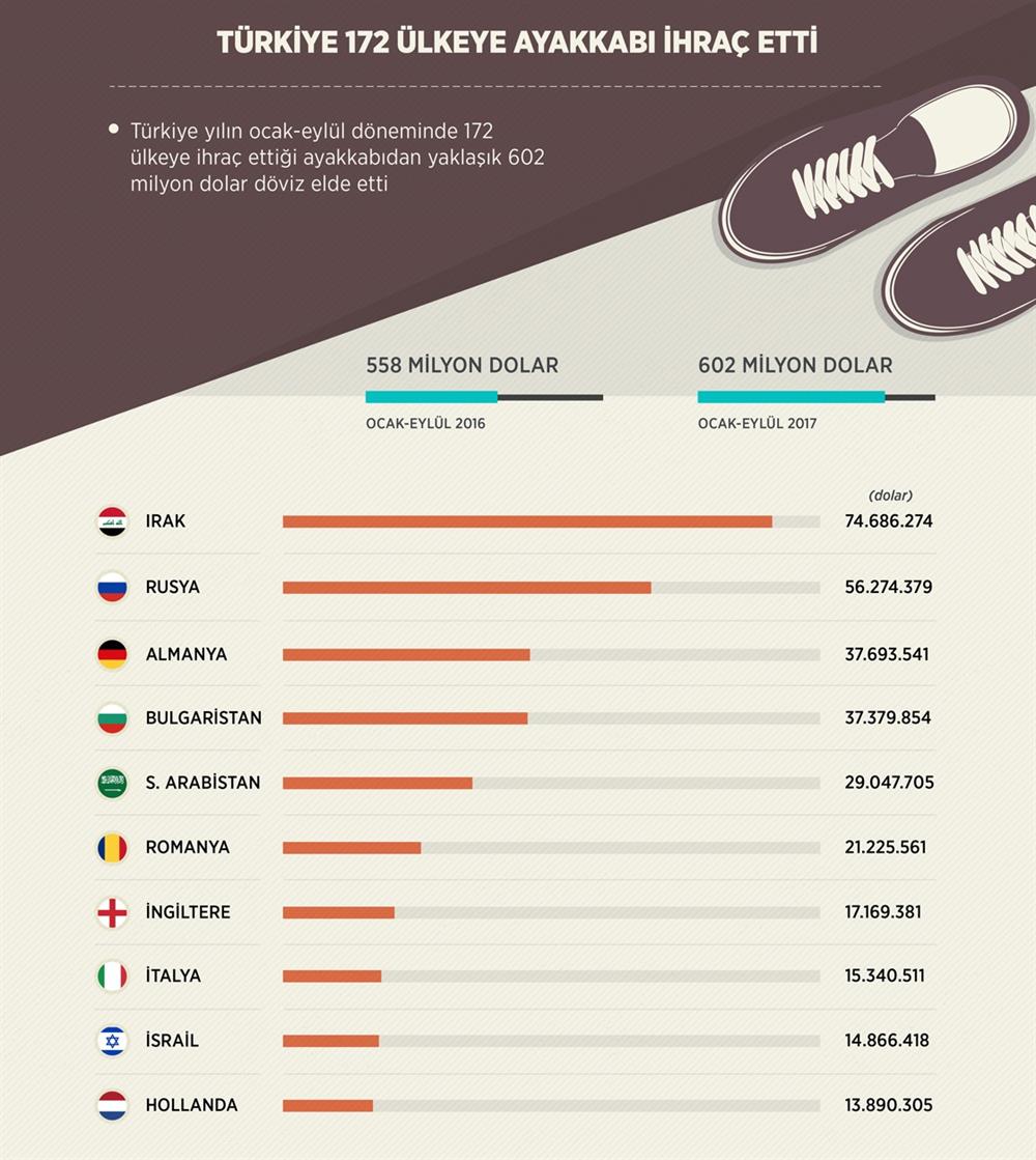 Ege Deri ve Deri Mamulleri İhracatçı Birliklerinden edindiği bilgiye göre, geçen yılın ocak-eylül döneminde 558 milyon dolarlık ayakkabı ihracatı gerçekleştiren Türkiye, 2017'nin aynı döneminde bu rakamı yüzde 8 artırarak 602 milyon dolarlık ihracata imza attı.