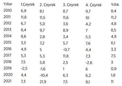 Buna göre, Türkiye ekonomisi 2021'de yüzde 11, geçen yılın son çeyreğinde yüzde 9,1 büyüme kaydetti.