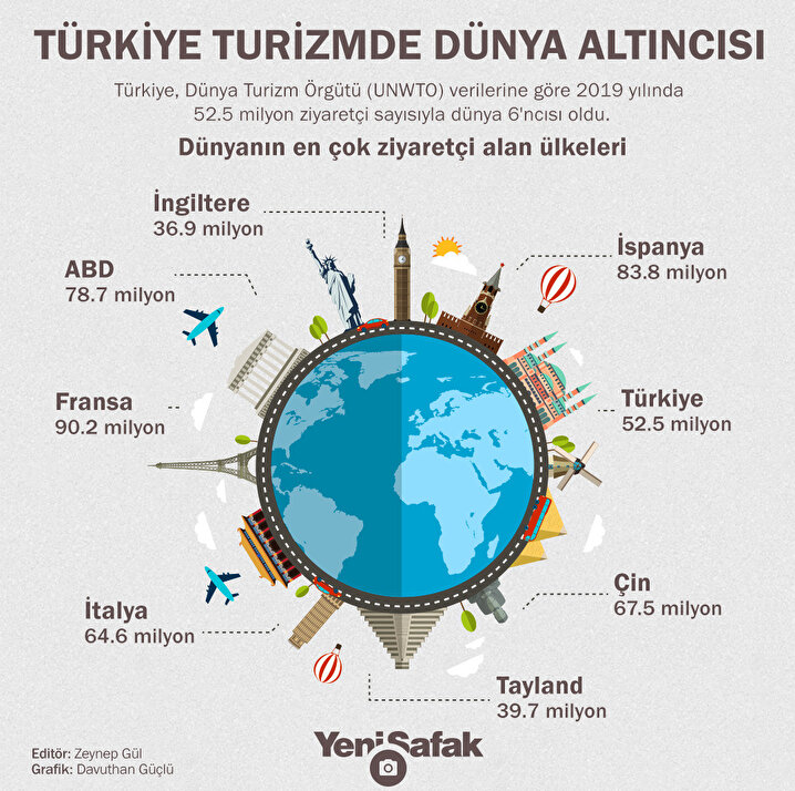 Bu rakamla dünyanın en çok turist ağırlayan ülkeleri sıralamasında Türkiye, 6. sırada yer aldı.