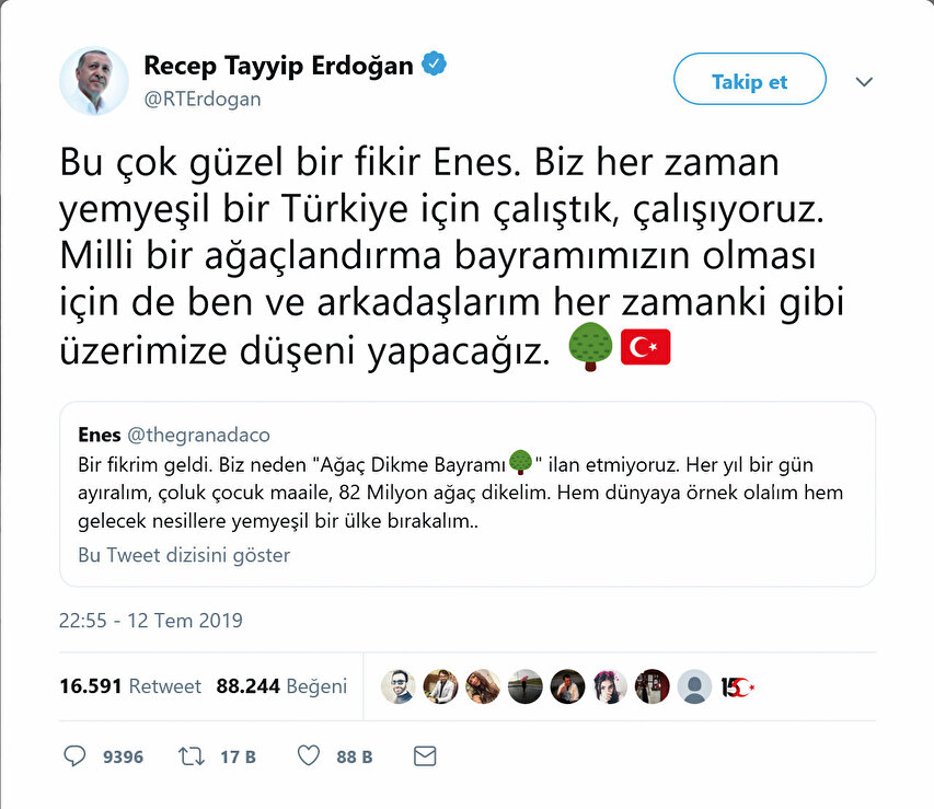 - Cumhurbaşkanı Erdoğan'ın paylaşımının ardından yayımlanan Cumhurbaşkanlığı Genelgesi ile 11 Kasım'ın her yıl 'Milli Ağaçlandırma Günü' olarak kutlanmasının uygun görüldüğü, Tarım ve Orman Bakanlığı'nın koordinasyonunda tüm kamu kurum ve kuruluşları ile gerçek ve tüzel kişilerin katılmasıyla saat 11.11'de başlayacak kampanyada yurt genelinde 11 milyon fidan dikilmesinin hedeflendiği belirtildi.