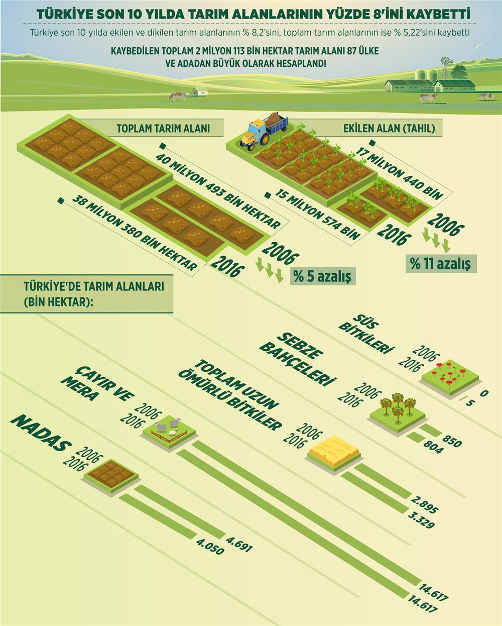 2006 yılıyla kıyaslandığında 10 yılda toplam tarım alanının yüzde 5,22 (2 milyon 113 bin hektar) azaldığı tespit edildi. Dünya Bankası verilerine göre yüzölçümü Türkiye'nin kaybettiği tarım alanlarından daha küçük 87 ülke mevcut. Bu ülkeler arasında Lübnan, Kuveyt, Senegal gibi ülkeler de bulunuyor.