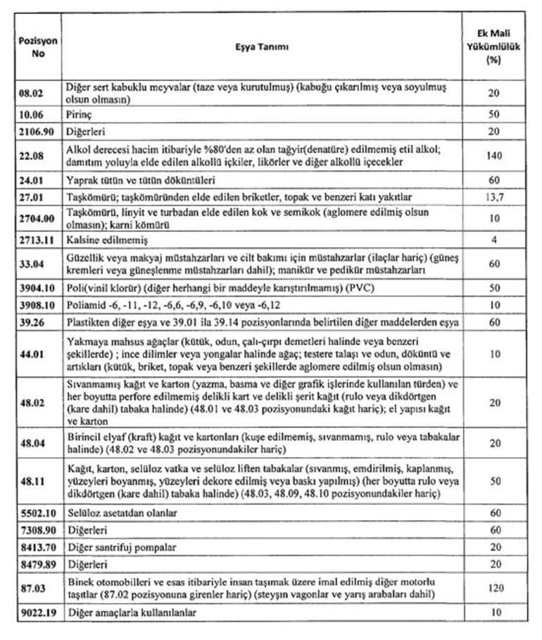 Buna göre, ithalatında ek mali yükümlülük tahsil edilecek bazı ABD menşeli ürünler ve uygulanacak yeni oranlar şöyle: