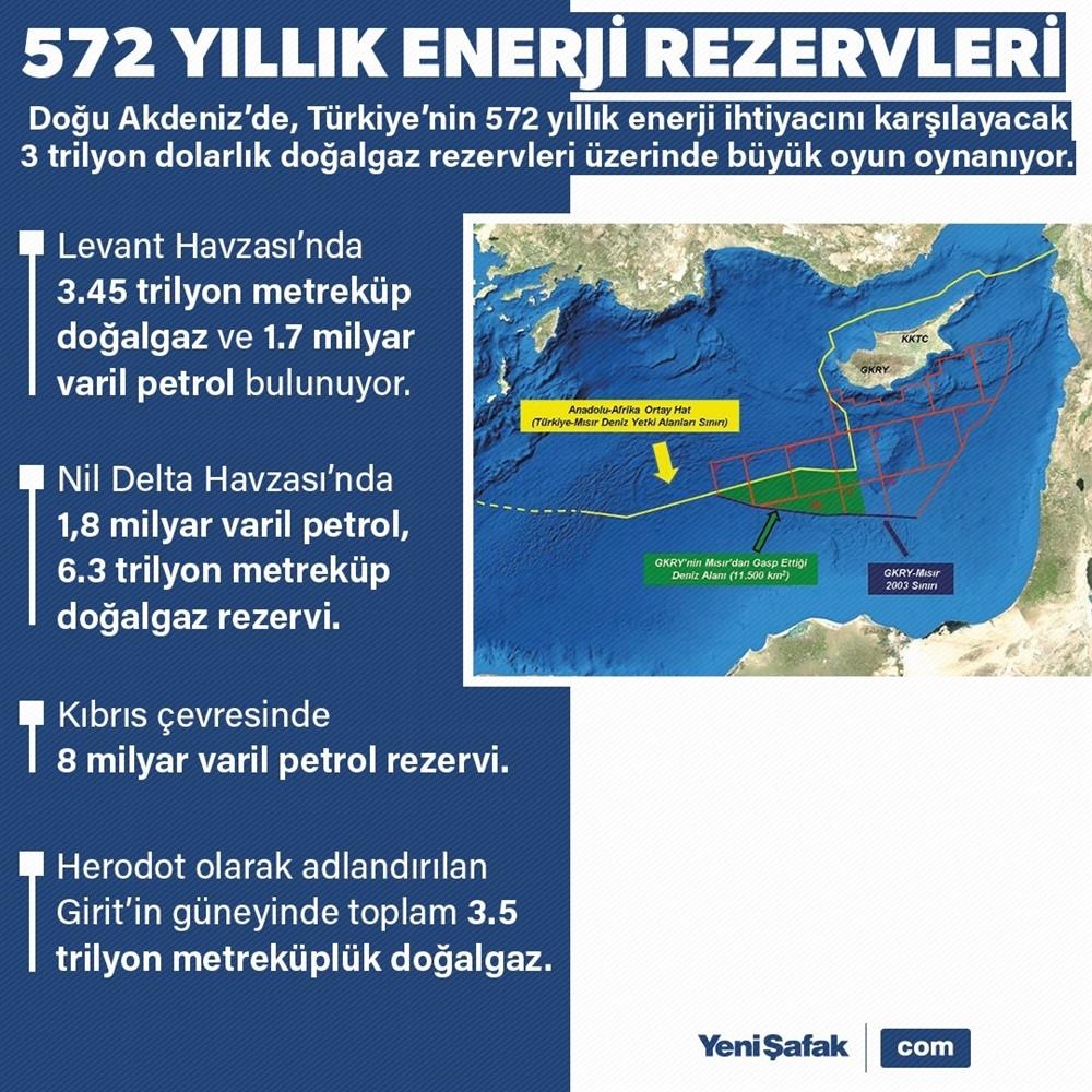 Uzmanlar tarafından yapılan tespitler, Doğu Akdeniz’de toplam değeri 3 trilyon doları bulan doğalgaz yatağı bulunduğunu gösteriyor. ABD Jeolojik Araştırmalar Merkezi tahminlerine göre Kıbrıs, Lübnan, Suriye ve İsrail arasında kalan bölge olan Levant Havzasında 3,45 trilyon metreküp doğalgaz ve 1,7 milyar varil petrol bulunuyor. Yine Nil Delta Havzasında yaklaşık 1,8 milyar varil petrol, 6,3 trilyon metreküp doğalgaz ve 6 milyar varil sıvı doğalgaz yatağı olduğu tahmin ediliyor. Kıbrıs Adası çevresinde olduğu düşünülen 8 milyar varil petrol yatağının dışında Heredot olarak adlandırılan Girit’in güney ve güneydoğusundaki alanda ise toplam 3.5 trilyon metreküplük doğalgaz bulunduğu tahmin ediliyor.