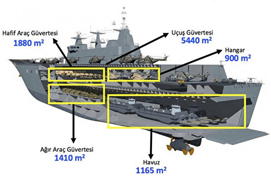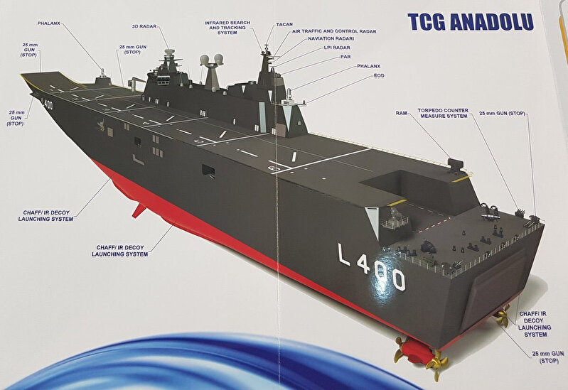 Türkiye'nin deniz savunmasındaki en önemli adımlarından biri 2016 yılında atıldı ve 4 yıllık çalışmada sona gelindi. 1 Temmuz 2020'de Liman Kabul Testleri'ne başlanan Türkiye'nin en büyük savaş gemisi TCG Anadolu gelecek yıl denize indirilecek. Yunan medyasının ''Üstünlüğü şok edici'' ifadeleri ile manşetlerine taşıdığı gemi 232 metre uzunluğa ve 32 metre genişliğe sahip olacak. Türk donanmasının ihtiyaçları doğrultusunda dizayn edilen TCG Anadolu, bu kapsamda savaş uçağı, helikopter ve İHA gibi 30 adet hava aracını da taşıyabilecekken havuzunda taşıyacağı çıkarma araçlarıyla da operasyonlara katılabilecek. Farklı donanımlara da sahip olan dev gemi gerektiğinde bine yakın kişiye tıbbi destek sağlayabilecek ve insani yardım operasyonlarında “hastane gemisi” olarak da görev yapabilecek.