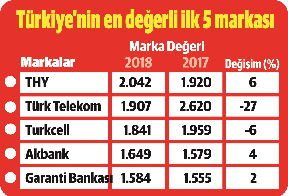 Marka değerlendirme kuruluşu Brand Finance'in yaptığı araştırmaya göre, 2 milyar doları aşan değeriyle "Türkiye'nin en değerli markası" Türk Hava Yolları oldu. 1 milyar 907 milyon dolar ile Türk Telekom ikinci olurken üçüncü sırada 1 milyar 841 milyon dolarlık marka değeri ile Turkcell yer aldı.