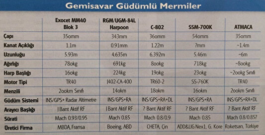 - HARPOON Blok II sistemi özelliklerine sahip olması, hatta geliştirilecek teknolojik sistemler neticesinde daha üstün özelliklerde olması beklenen ATMACA’nın menzilinin ise 120 mil (190+ km) olması planlanıyor. Atmaca, Türkiye’nin ilk deniz füzesi olma özelliğini de taşıyacak.