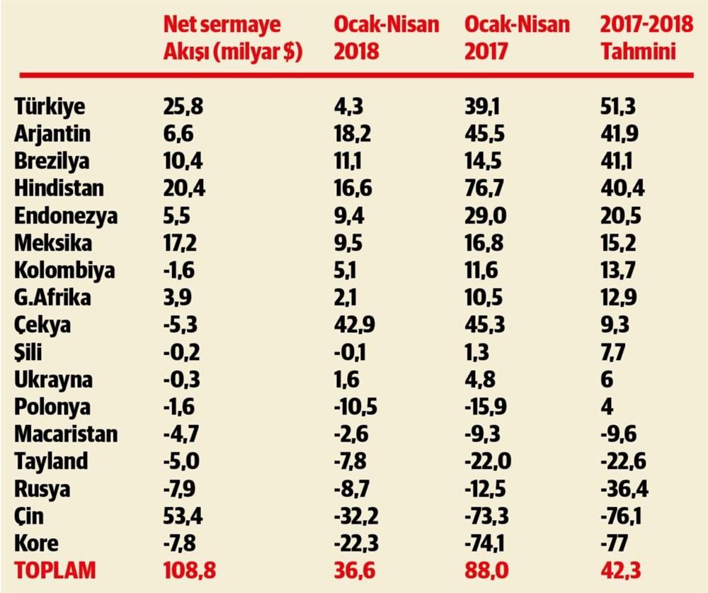 Uluslararası Finans Enstitüsü (IIF) verilerine göre, bu yıl gelişmekte olan ülkeler içinde en fazla sermaye girişin 51,3 milyar dolarla Türkiye'ye, en fazla çıkışın ise 77 milyar dolarla Kore'de olacağı öngörülüyor. IIF tahminlerine göre, bu yıl Çin, Macaristan, Kore, Rusya ve Tayland'da sermaye çıkışı, Türkiye, Arjantin, Brezilya, Şili, Kolombiya, Çek Cumhuriyeti, Hindistan, Endonezya, Meksika, Polonya, Güney Afrika ve Ukrayna'da ise sermaye girişi yaşanacak.