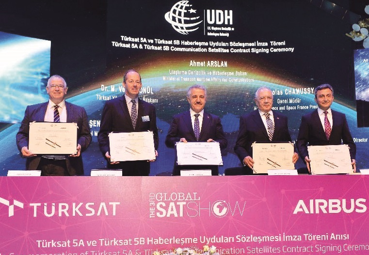 Türksat uyduları 5A ve 5B uydularının yapımı ve iki uydunun 2020-2021 yıllarında uzaya fırlatılması için imzalar dün atıldı. MÜSİAD stratejik partnerliğinde ve Uydu Operatörleri Birliği (ESOA) ev sahipliğinde İstanbul’da düzenlenen 3.Global Satshow zirvesi kapsamında düzenlenen törende anlaşmanın tarafları Türksat ile Airbas firmaları masaya oturdu.