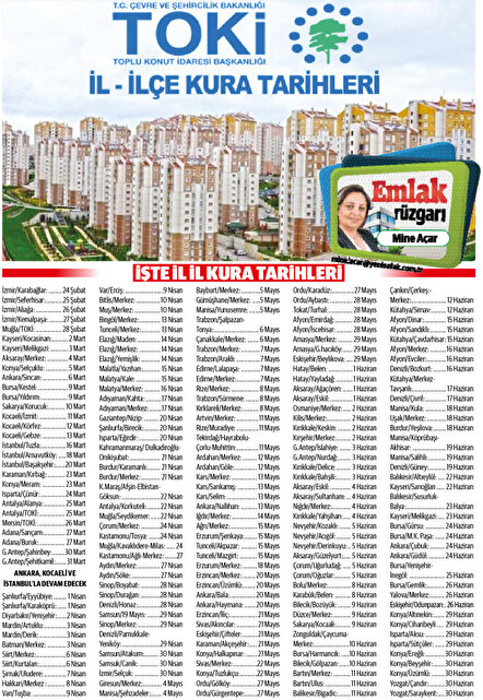 - İstanbul'da 3 projede yapılacak 10 bin konut için 375 bin 953 kişi başvurmuştu. Tuzla'daki 5 bin 750 konut için 117 bin 650 başvuru yapılmıştı. Tuzla kura töreni 16 Mart pazartesi yapılacak. Arnavutköy'de yer alan 3 bin 750 konut için 18 Mart, Başakşehir'deki 500 konut için de 20 Mart'ta kura çekilecek. Ankara'da 7 projede talep toplanan 4 bin konut için kura çekimi martın ikinci haftasında yapılacak. İlk kura Sincan'daki 2.300 konut için 6 Mart'ta olacak. Bursa Yıldırım Projesi'nin 9 Mart, 47 bin 931 başvurunun yapıldığı Gaziantep Şahinbey Projesi'nin 30 Mart'ta kura törenleri gerçekleştirilecek.