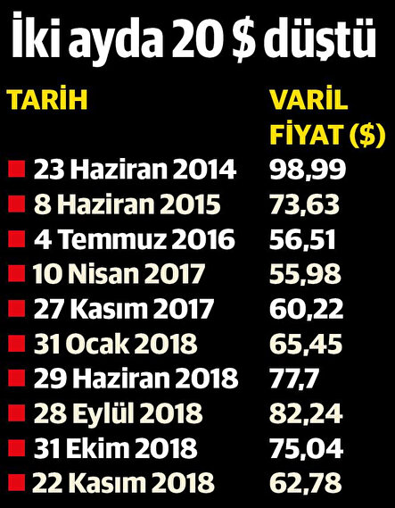Ham petrolün varil fiyatı son iki ayda yüzde 24 düşüşle 62 dolara kadar geriledi. Ham petrol fiyatlarının bir miktar daha düşmesi bekleniyor. Rusya Merkez Bankası Başkanı Elvira Nabiullina, 2019’da 35 doları bir risk senaryosu olarak dikkate aldıklarını söyledi. Bu düşüş Türkiye’de akaryakıtın pompa fiyatlarına yansımaya başladı. Benzinde yapılan toplam 55 kuruşluk indirimin ardından motorindeki indirimin de bugün 14 kuruş olarak pompa fiyatlarına yansıması bekleniyor. Bu, motorine 6 ay sonra yapılan ilk indirim olacak.