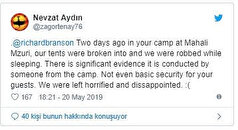 Yaşanan olayı sosyal medya hesabı üzerinden paylaşan Aydın, kampın sahibi İngiliz milyarder Richard Branson’u da etiketleyerek attığı tweetinde şu ifadeleri kullandı.