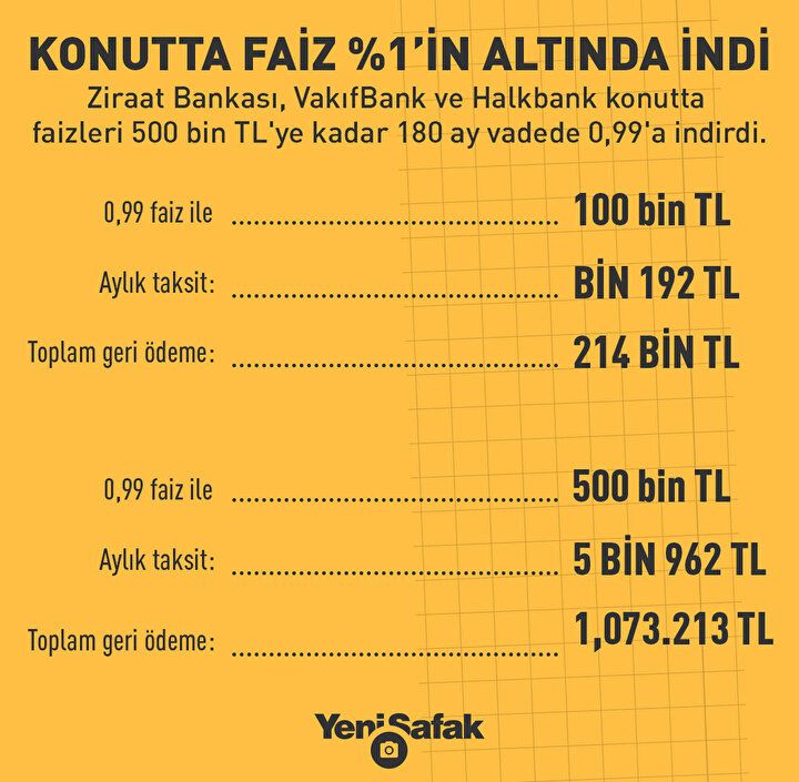 Bu kapsamda banka, yarından itibaren geçerli olmak üzere, tutarı 500 bin liraya kadar konut kredilerine yönelik aylık faiz oranlarını, azami 180 ay vade için yüzde 1'in altına çekerek yüzde 1,49'dan yüzde 0,99'a indirdi.