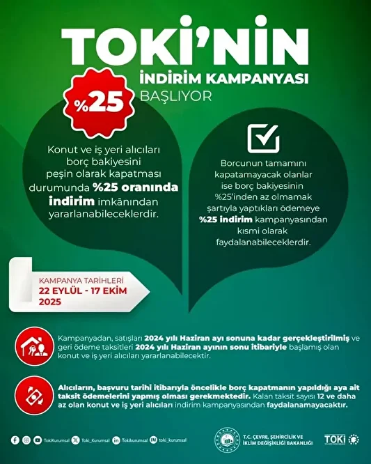 Çevre, Şehircilik ve İklim Değişikliği Bakanlığına bağlı Toplu Konut İdaresi Başkanlığı (TOKİ), geri ödemeleri devam eden konut ve iş yerleri için yüzde 25 indirim kampanyasını yarın başlatıyor.