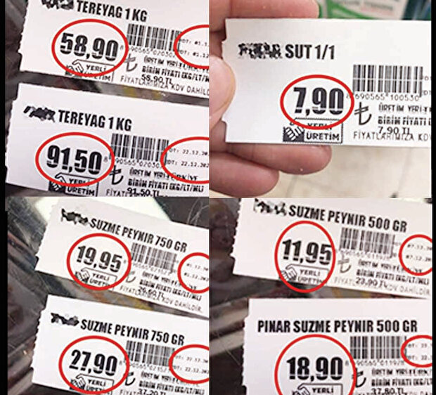 Kurdaki düşüşe rağmen etiketlerde bu fiyat aynen duruyor. Aynı şekilde makarna fiyatları 2,5 TL’den 5,5 TL’ye, 5 litrelik Ayçiçek yağı 44 TL’den 125 TL’ye yükseltilmişti. Ancak bu fiyatlarda da bir gerileme olmadı.