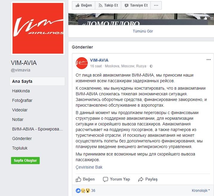 Yaz sezonu sonuna dek 200 bin yolcuya bilet satan VIM-Avia, maddi sorunlar nedeniyle operasyonlarını durdurdu. Rusya Tur Operatörleri Birliği ATOR yaklaşık 100 bin turistin ortada kaldığını belirtiyor.