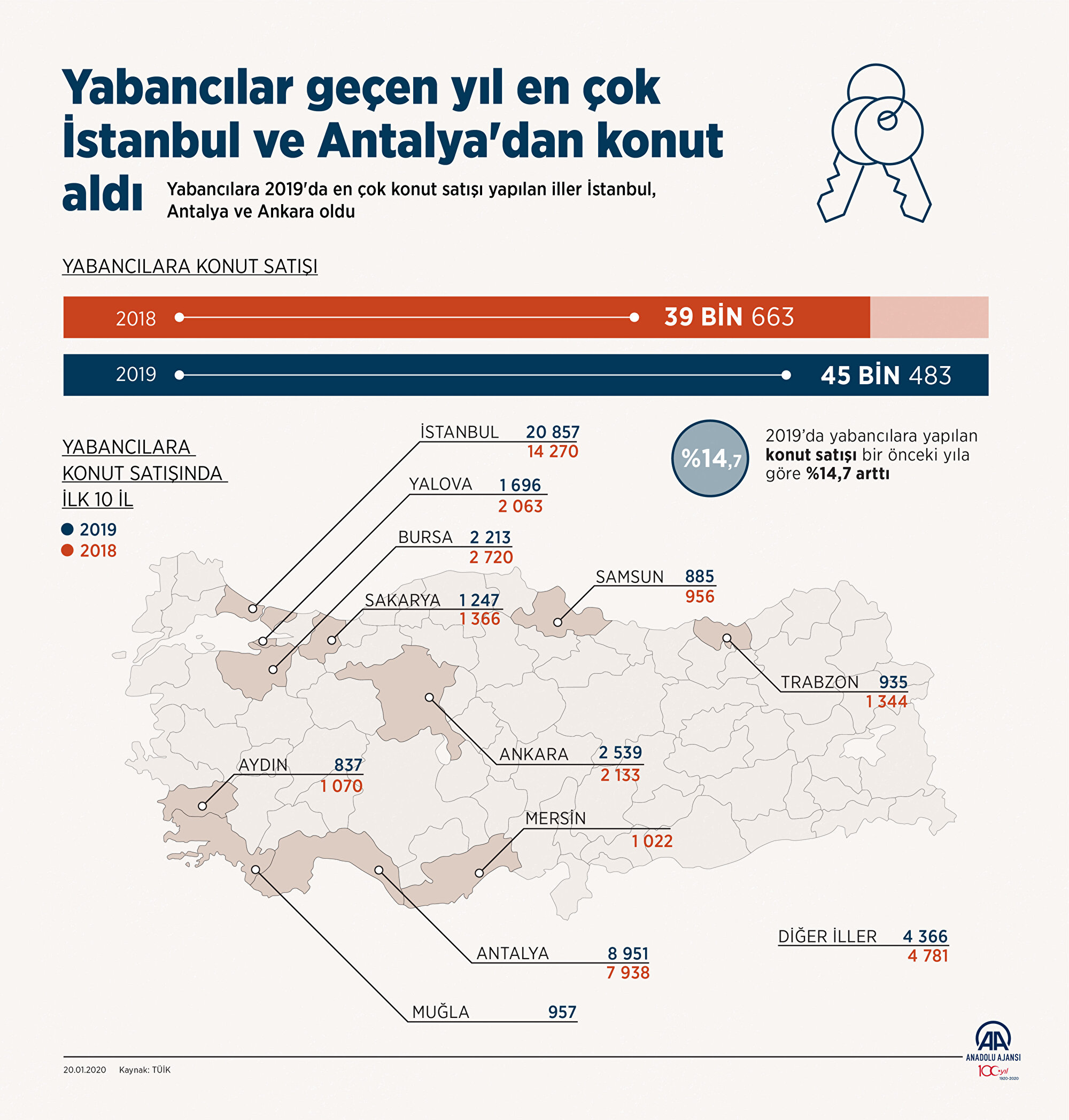 Yabancılara 2019'da en çok konut satışı yapılan iller İstanbul, Antalya ve Ankara oldu. İstanbul'daki satışlar geçen yıl 2018'e kıyasla yüzde 46,2 artarak 20 bin 857'yi bulurken, Antalya'da 8 bin 951, Ankara'da 2 bin 539 konut satışı gerçekleşti.