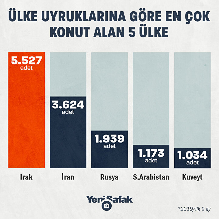 Yabancıya konut satış istatistiklerine bakıldığında ülke uyruklarına göre en çok konut satışı ise Irak vatandaşlarına yapıldı. Irak'ı sırasıyla, İran, Rusya, Suudi Arabistan ve Kuveyt izledi.