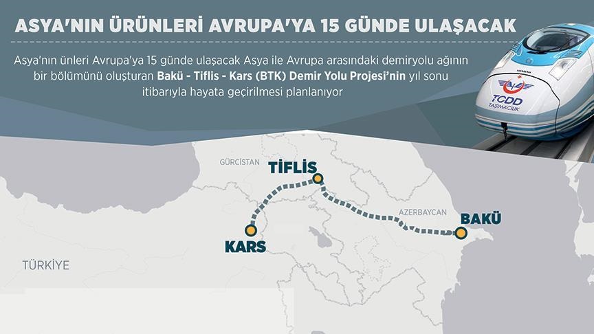 Ulaştırma, Denizcilik ve Haberleşme Bakanı Ahmet Arslan, Bakü-Tiflis-Kars demiryolu hattı için çalışmaların devam ettiğini ifade ederek, "Yaklaşık 2 aylık bir işimiz kaldı. Şu anda yoğun bir şekilde çalışıyoruz ama kış şartlarının zorluklarını da hesaba katarak mart, nisan gibi inşaatı bitirmeyi planlıyoruz" dedi.