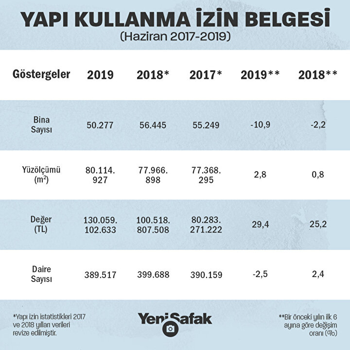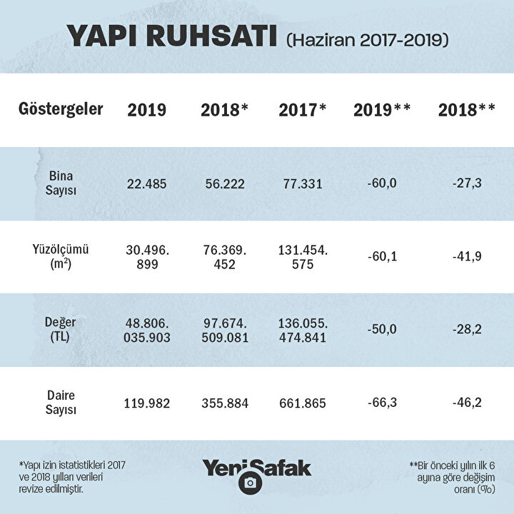 Türkiye İstatistik Kurumu tarafından 3 aylık dönemler üzerinden açıklanan yapı izin istatistiklerine de yansıyan tabloya göre; belediyeler tarafından yılın ilk 6 ayında verilen yapı ruhsatlarında bina sayısı geçen yılın aynı dönemine göre yüzde 60 azaldı.