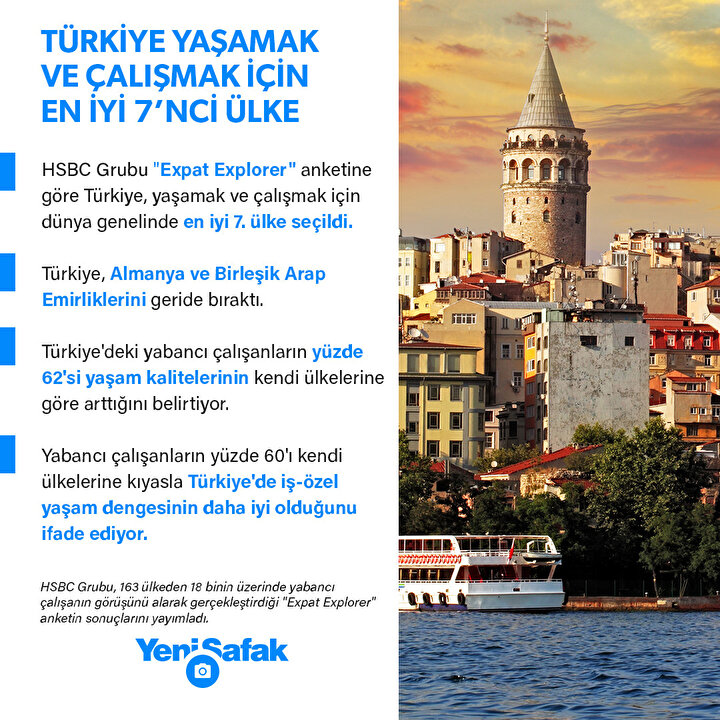 HSBC Grubu "Expat Explorer" anketine göre Türkiye, yaşamak ve çalışmak için dünya genelinde en iyi 7. ülke seçildi. Türkiye, Almanya ve Birleşik Arap Emirliklerini geride bıraktı. Türkiye'deki yabancı çalışanların yüzde 62'si yaşam kalitelerinin kendi ülkelerine göre arttığını belirtiyor. Yabancı çalışanların yüzde 60'ı kendi ülkelerine kıyasla Türkiye'de iş-özel yaşam dengesinin daha iyi olduğunu ifade ediyor.