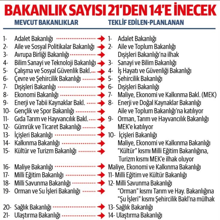 Şimdiye kadar çok konuşulan bakanlık birleşmeleriyle ilgili Ankara’da hazırlanan taslak çalışmaya göre; birçok bakanlık tek çatı altında toplatılıyor. Yeni dönemin bakanlık listesi taslak çalışmasına göre; Avrupa Birliği Bakanlığı, Ekonomi Bakanlığı, Gençlik ve Spor Bakanlığı, Gümrük ve Ticaret Bakanlığı, Kalkınma Bakanlığı, Kültür ve Turizm Bakanlığı, Maliye Bakanlığı ile Orman ve Su işleri Bakanlığı olmayacak.