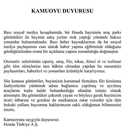 "Bazı sosyal medya hesaplarında, bir Honda bayisinin araç parkı görüntüleri ile bayinin satış yerine stok yaptığı yönünde haksız yorumlar bulunmaktadır. Bazı haber kaynaklarının da bu sosyal medya paylaşımını esas alarak haber yapma eğiliminde olduğunu gördüğümüzden resmi bir açıklama yapma zorunluluğu doğmuştur.