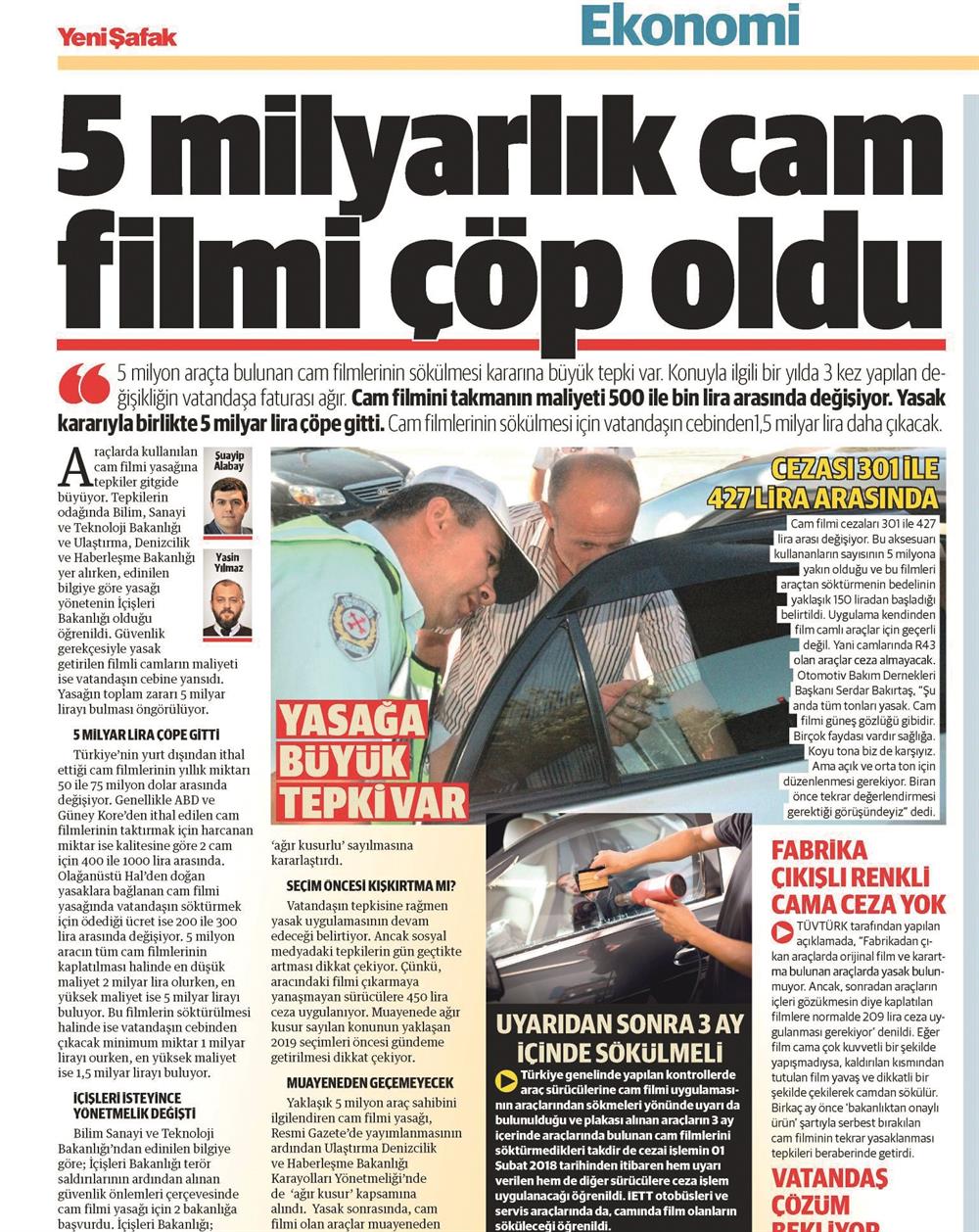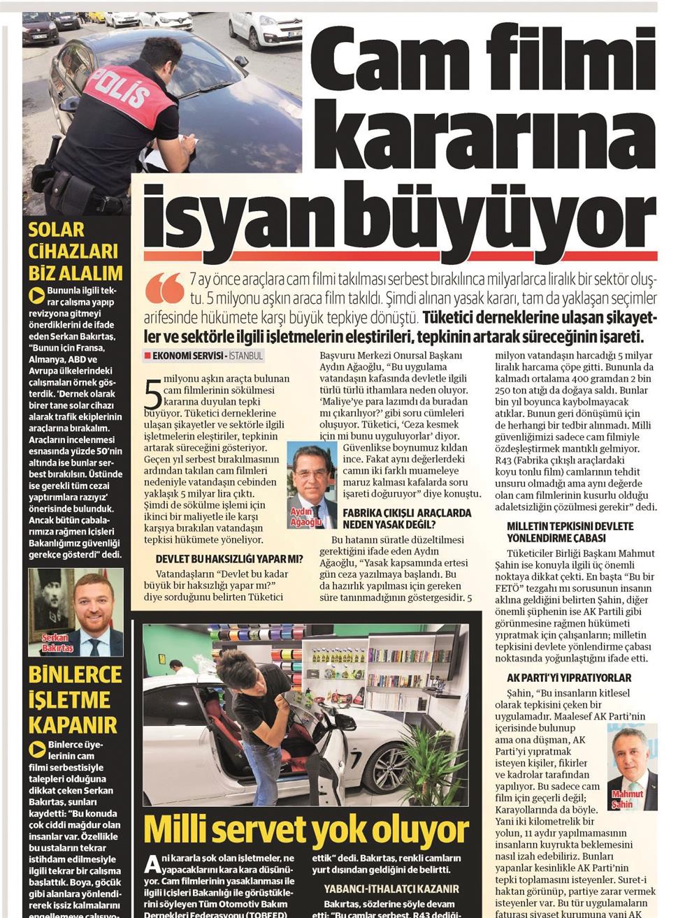 Geçtiğimiz haftalarda cam filmi yasağının gündeme gelmesi sonrası yasağın esnetilmesi adına Yeni Şafak'ın yaptığı haberler, vatandaş tarafında olumlu karşılık buldu. Tüketici Başvuru Merkezi Onursal Başkanı Aydın Ağaoğlu ile Tüketiciler Birliği Başkanı Mahmut Şahin, ilgili yayınlarından dolayı Yeni Şafak'a teşekkür etti. Ağaoğlu, gazetemizin yaptığı etkili yayınların Ankara'da karşılık bulduğuna dikkat çekti. Araç filmi konusunda gazetemize değerlendirmelerde bulunan Şahin ise "Bir haber yaptınız. Cam filmi konusunda kamuoyun beklentisi doğrultusunda gelişmeler oldu" dedi.