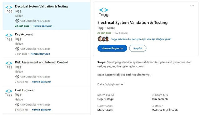 Türkiye'nin Otomobili Girişim Grubu (TOGG), birçok farklı alanda ve bölgede işe alımlar için yeni ilanlar açtı.