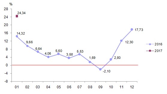 Yurt Dışı Üretici Fiyat Endeksi, 2017 yılı Ocak ayında bir önceki aya göre yüzde 7,25, bir önceki yılın Aralık ayına göre yüzde 7,25, bir önceki yılın aynı ayına göre yüzde 24,34 ve on iki aylık ortalamalara göre yüzde 7,62 artış gösterdi.