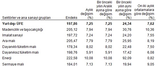 Buna göre, ülke sınırları içinde üretimi yapılarak yurt dışına ihraç edilen malların üretici fiyatlarındaki değişimi ölçen yurt dışı üretici fiyat endeksi (YD-ÜFE), 2017 yılı Ocak ayında bir önceki aya göre yüzde 7,25, bir önceki yılın Aralık ayına göre yüzde 7,25, bir önceki yılın aynı ayına göre yüzde 24,34 ve on iki aylık ortalamalara göre yüzde 7,62 artış gösterdi.