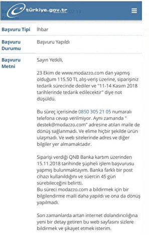 Arkadaşımın aldığı ayakkabıyı beğenince söz konusu siteye girdi. İndirim kodu veriyorlardı bir de siteye girince %30 kadar bir indirim daha yapıyordu. Ayakkabıyı çok beğendiğimden ve bitmesinden korktuğumdan hemen ben de aynısını aldım. Ertesi gün nereden estiyse internette modazzoyu araştırdım, gördüğüm yorumlarda herkes ürününün gelmediğini söylüyordu. O an anladım bir şeylerin ters gittiğini modazzo müşteri hizmetlerini aradım yaklaşık 15 gün sonrasına tarih vererek gelecek dediler. Ürünü satın almamım üzerinde 3 ay geçti neredeyse ne ürün var ortada ne de para iadesi.