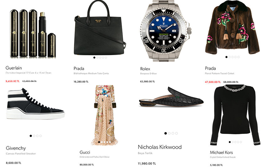Prada, Louis Vuitton ve Michael Kors gibi dünyaca ünlü markaların ürünlerinin satıldığı sitede fiyatlar da dudak uçuklatacak seviyede. 5 bin TL’ye kazak, 11 bin TL’ye de terlik satılan sitede 47 bin TL’lik çeket ile 80 bin TL’lik elbise ise dikkat çekiyor.