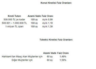 Halkbank'tan yapılan açıklamaya göre, tüketici kredilerinde 60 aya kadar vade imkânıyla aylık yüzde 1,49'dan başlayan faiz oranları sunan Banka, konut sahibi olmak isteyen müşterilerine özel aylık yüzde 0,99'dan başlayan seçeneklerle de konut kredisi desteği sağlayacak. Ayrıca, Halkbank ile aktif çalışan konut sektörü firmaları Banka’ya katkı payı ödeyerek, müşterilerine %0,79 faiz oranı ile kredi kullanma imkânı sağlayabilecek.