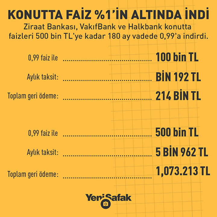 Bankadan yapılan açıklamada konut kredisi faizinin 180 ay vadede yüzde 0.99'a çekildiği duyuruldu.