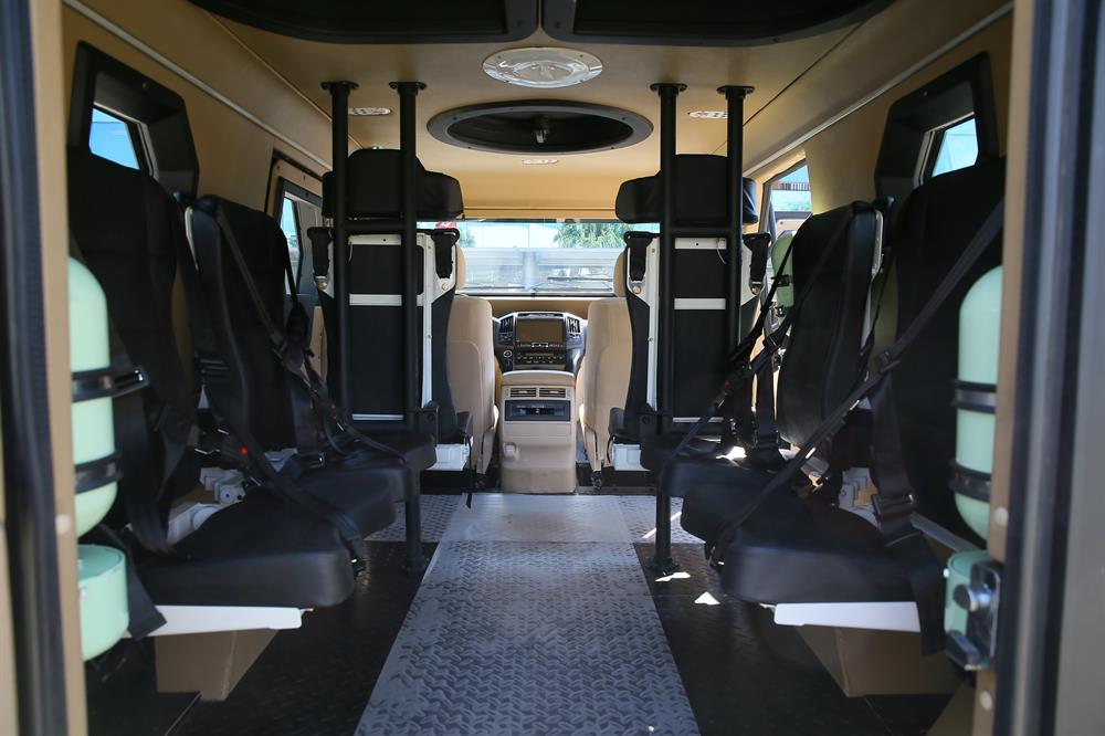 - Araç 5 hasta, 2 sağlık personeli ve sürücü dahil 8 kişilik taşıma kapasitesine sahip. 300 beygir gücüne ve 4x4 sürüş özelliklerine sahip ve her türlü yol ve iklim koşullarına uygun üretilen zırhlı ambulanslar, sürücü, sağlık personeli ve hastanın tam emniyetini sağlıyor. Ayrıca, istenilen konfigürasyonda ve farklı balistik seviyelerine uygun dizayn edilebiliyor.