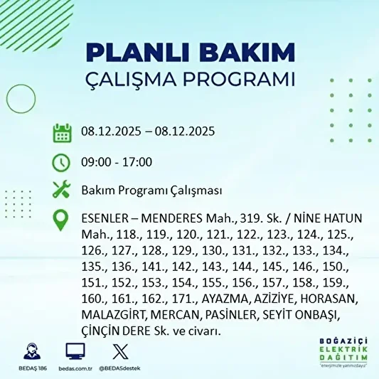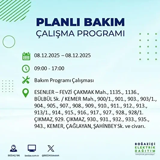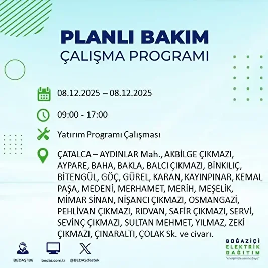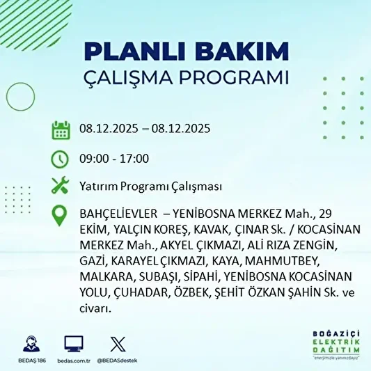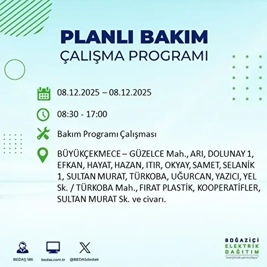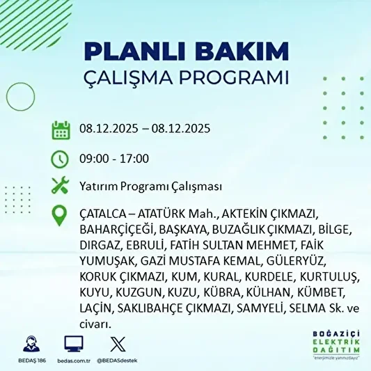 BEDAŞ 8 Aralık elektrik kesintilerinin yapılacağı ilçeler