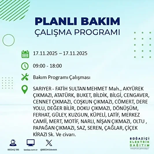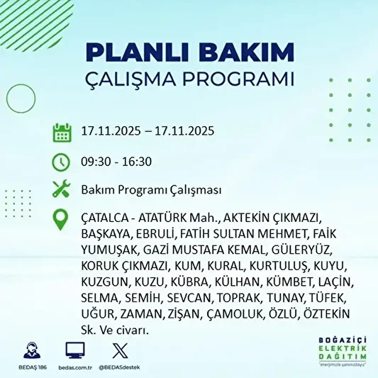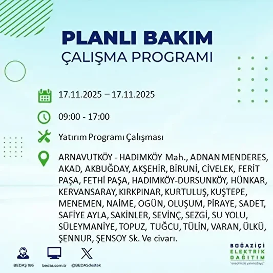 BEDAŞ 17 Kasım elektrik kesintilerinin yapılacağı ilçeler