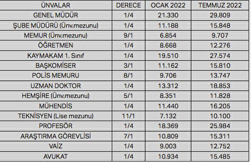Bu artışlar neticesinde Temmuz 2022 dönemi itibarıyla bazı kamu görevlilerinin net görev aylıkları şu şekilde belirlendi: