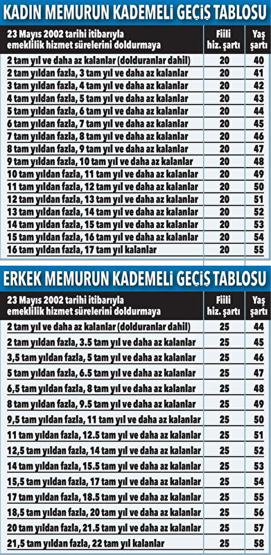 Erkek memurlar 15 tam yıl (5400 gün) fiili hizmet süresi ve 61 yaşın doldurma şartlarına tabi tutulmaya başlandı.