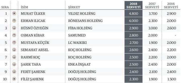 Murat Ülker, 4,8 milyar dolarlık kişisel serveti ile "En Zengin 100 Türk" listesinde zirveye oturdu. Rönesans Holding Başkanı Erman Ilıcak 4 milyar dolarlık servetiyle listede ikinci olurken, Fiba Holding Yönetim Kurulu Başkanı Hüsnü Özyeğin 2,9 milyar dolarlık serveti ile üçüncü oldu.